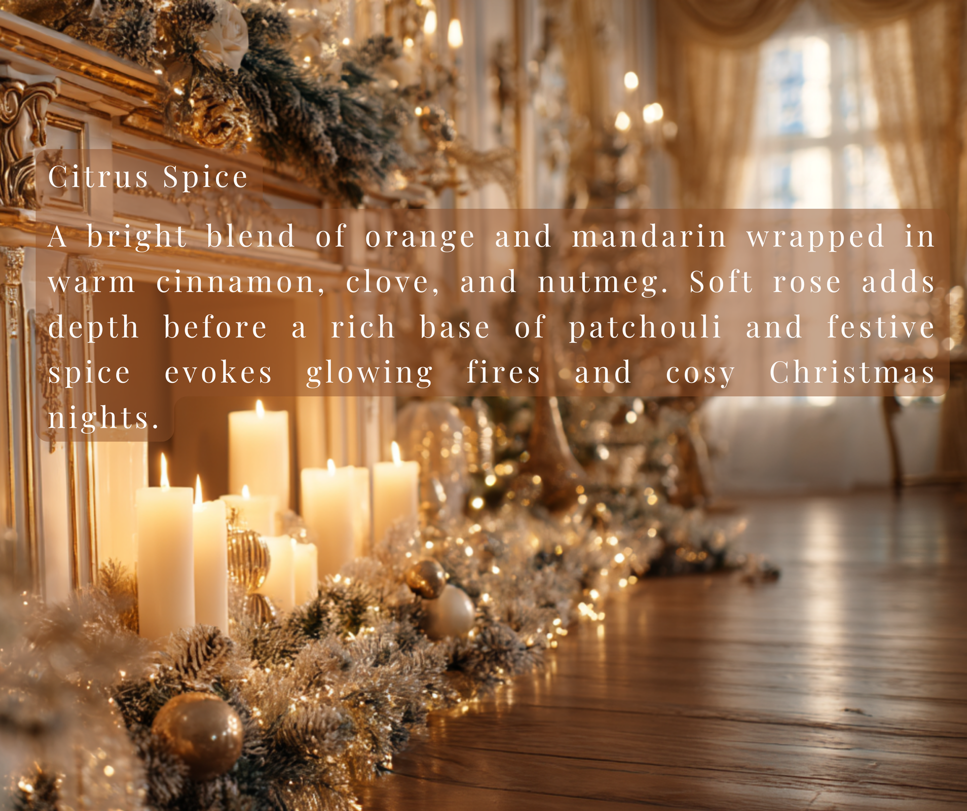 Citrus Spice opens with a sweet, sparkling burst of bright citrus, where juicy orange and zesty mandarin instantly lift the mood and add that unmistakable Christmas brightness.