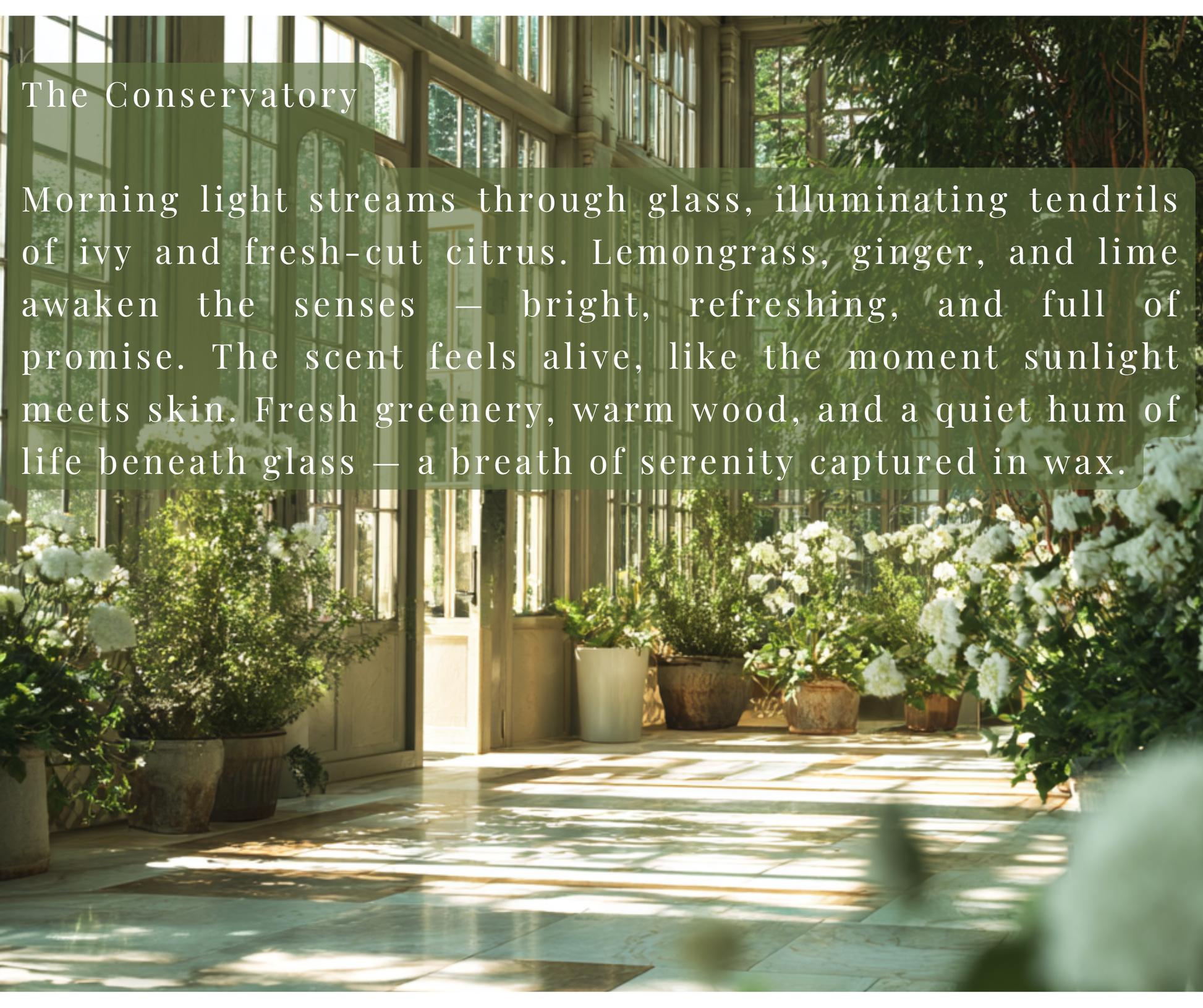 The Conservatory awakens with the first light of day — golden beams filtering through glass, illuminating clusters of fresh herbs and flowering citrus. The air feels alive, filled with the brightness of lemongrass and the warmth of ginger root, swirling together in a tranquil symphony of sunlight and spice.